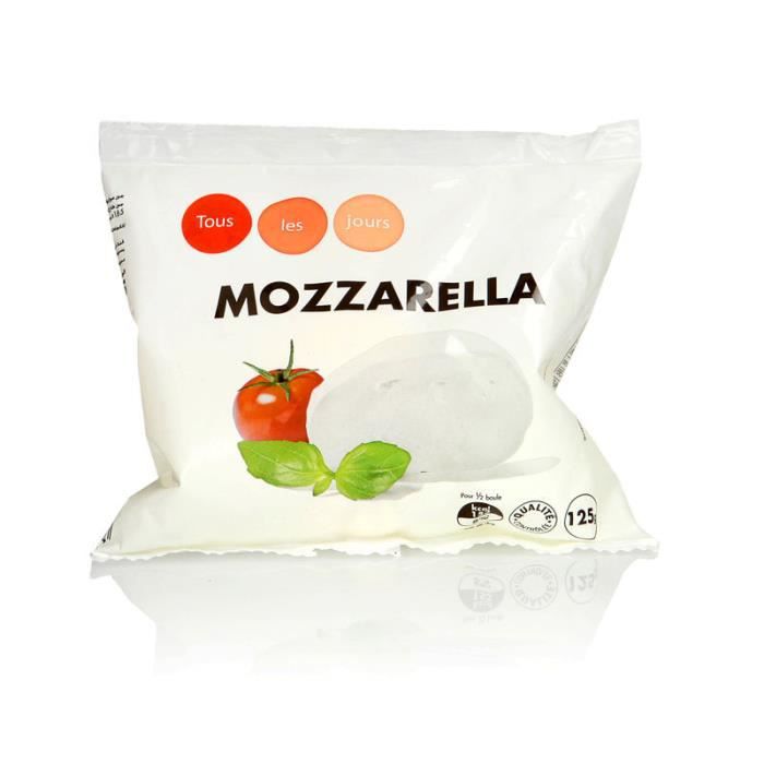 Mozzarella - Fromage à pâte filée en saumure au lait de vache pasteurisé. Ingrédients : _Lait_ pasteurisé de vache (origine Allemagne et Autriche) - sel...