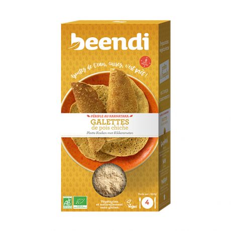 Galettes de pois chiches. Ingrédients : Farine de pois chiche* (90,5%), Farine de riz complet*, Cumin*, Sel de Guérande non raffiné, Bicarbonate de soude, Feuilles...