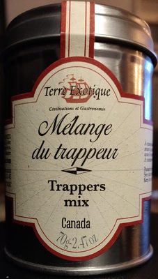 Mélange Du Trappeur. Ingrédients : Sucre, coriandre, légumes déshydratés (ail, oignon, poivron rouge), sel de mer, poivre noir, sucre d'érable, essence naturelle d'erable, huile végétale...