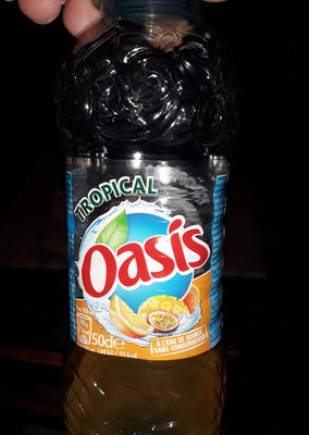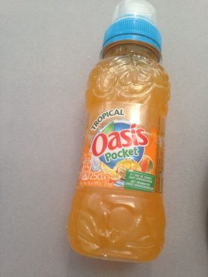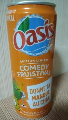 Oasis Tropical Canette. Ingrédients : eau de source 80%, jus de fruits à base de concentrés 12% (orange 6,4%, pomme 5,5%, fruit de la passion...
