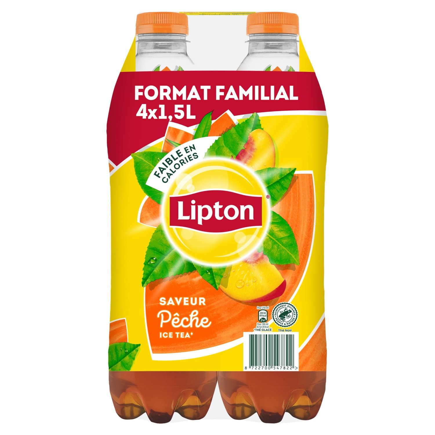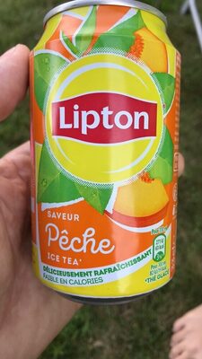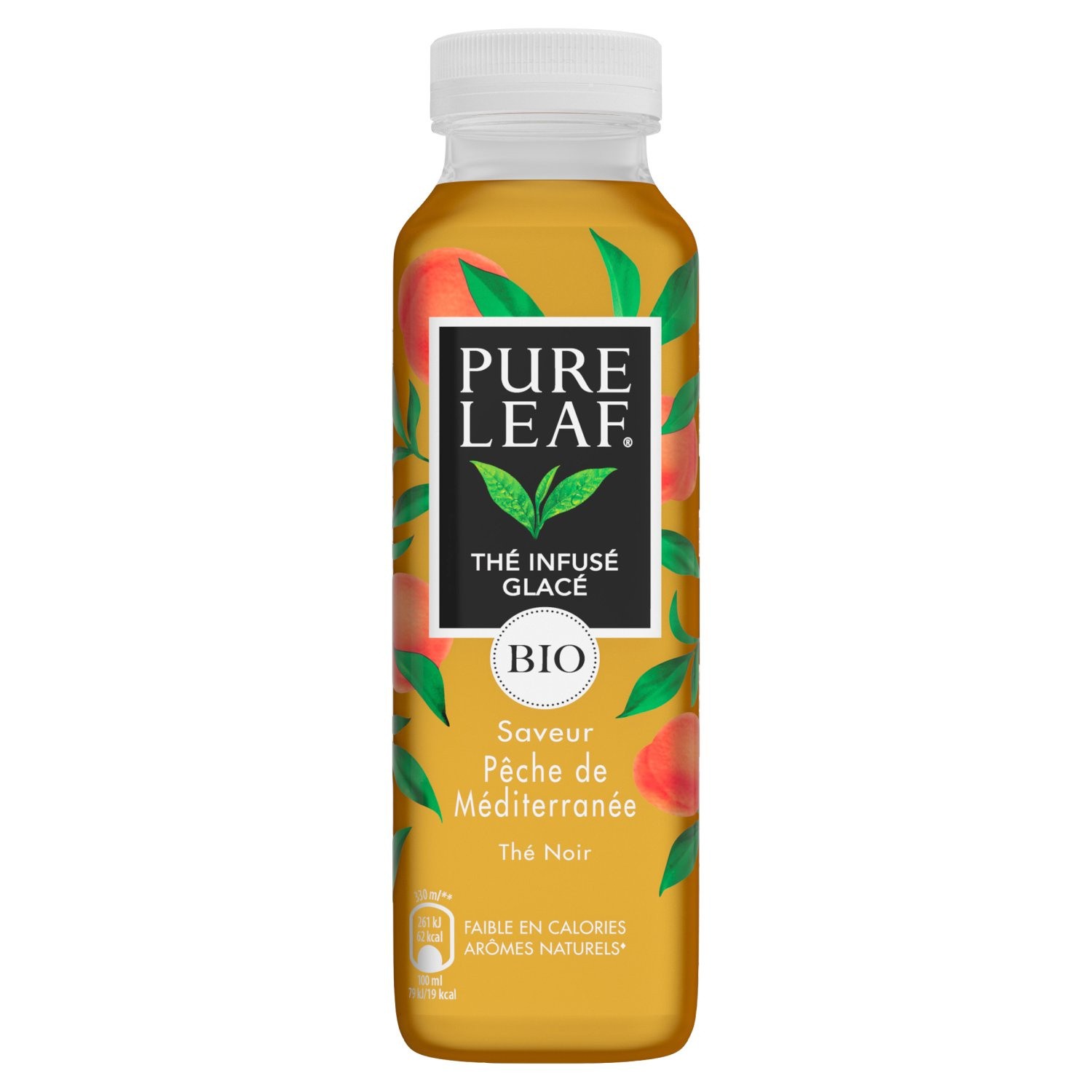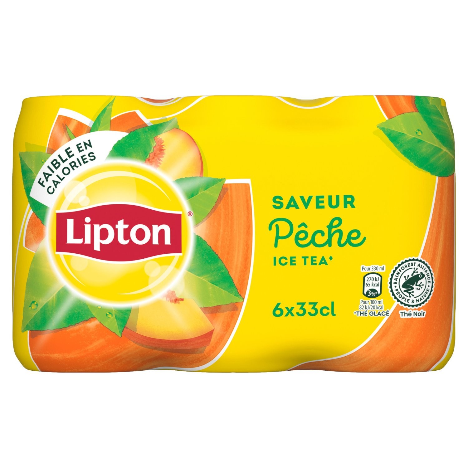 Pêche. Ingrédients : eau, sucre, acidifiant (acide citrique), extrait de thé noir (1 ,4g/l), jus de pêche à base de concentré (0,1 %), arômes, antioxydant...