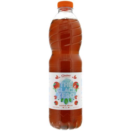 Thé glacé. Ingrédients : eau, sucre, acidifiant (acide citrique), extrait de thé noir (1,4 g/l), jus de pêche à base de concentré (0,1%), arôme, antioxydant...