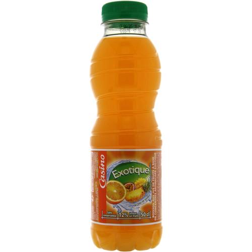 Boisson aux jus de fruits à base de concentrés aromatisée exotique. Ingrédients : Eau de source 82.1% - jus de fruits à base de concentrés...