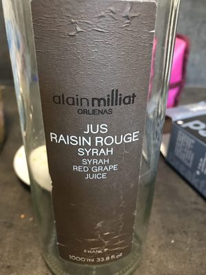 Jus de Raisin Rouge Syrah. Ingrédients : jus de raisin rouge Syrah 100% Quantité : 1 l Marque : Alain Milliat