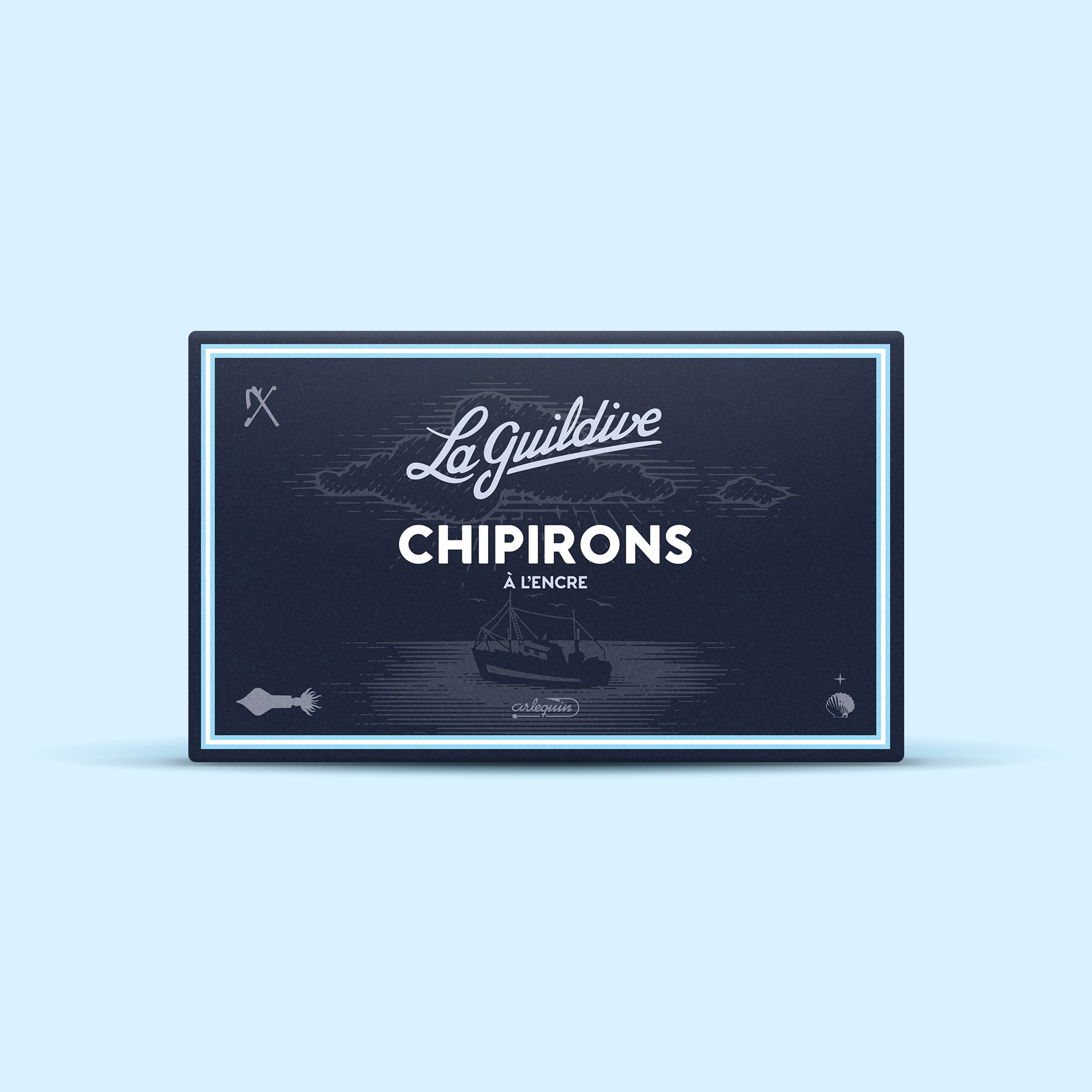 Chipirons à l'encre. Ingrédients : (61%), huile de tournesol, tomate, encre (2%), oignons, épices et sel. Marque : La Guildive