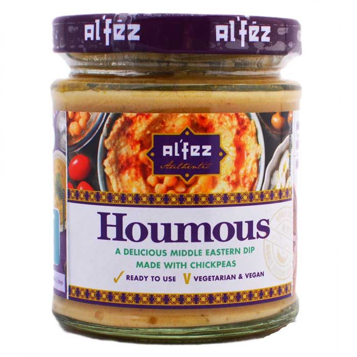 Houmous. Ingrédients : pois chiches 39%, eau, pâte de sésame, huile d'olive, purée d'ail (avec acidifiant: acide citrique), jus de citron concentré, sel de cuisine,...