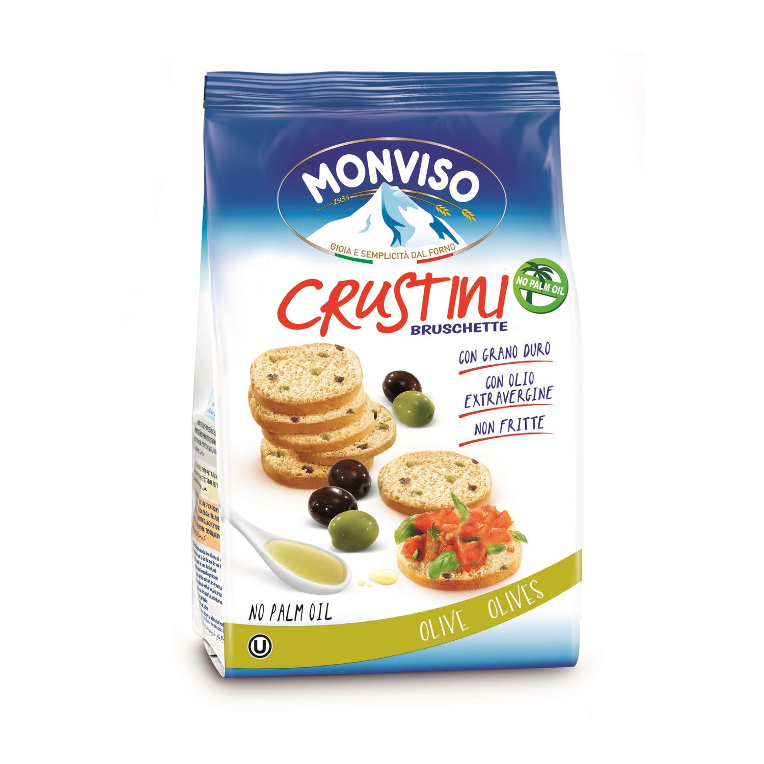 Mini bruschette olive. Ingrédients : Farine de _blé_ tendre, semoule de _blé_ dur remoulue, olives vertes et noires 10 %, huile d'olive 9 %, huile...