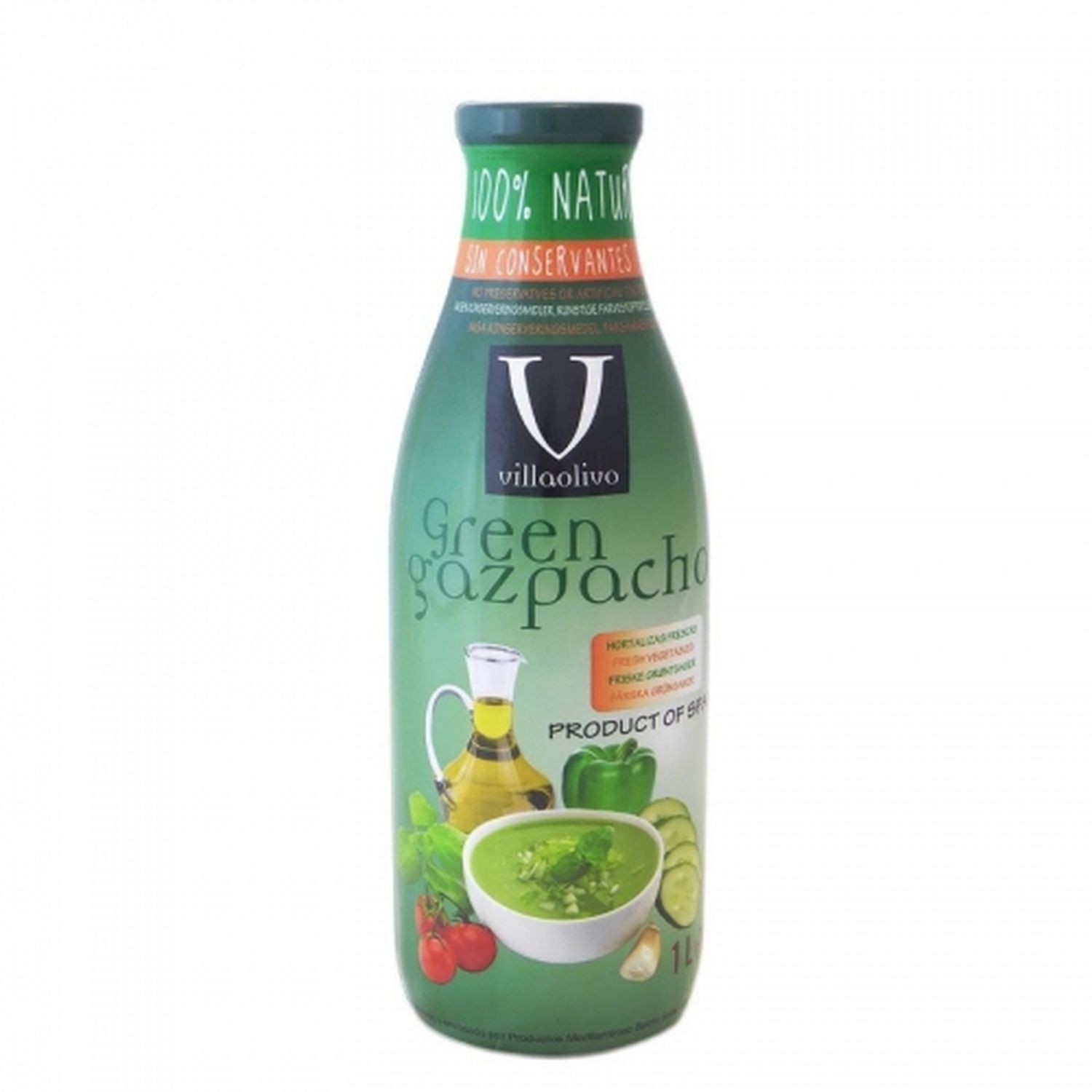 Gaspachio "Green. Ingrédients : Concombre, poivron, tomate, huile d'olive vierge extra 3%, vinaigre de vin, sel, origan, ail. Quantité : 1 l Marque : Villaolivo...