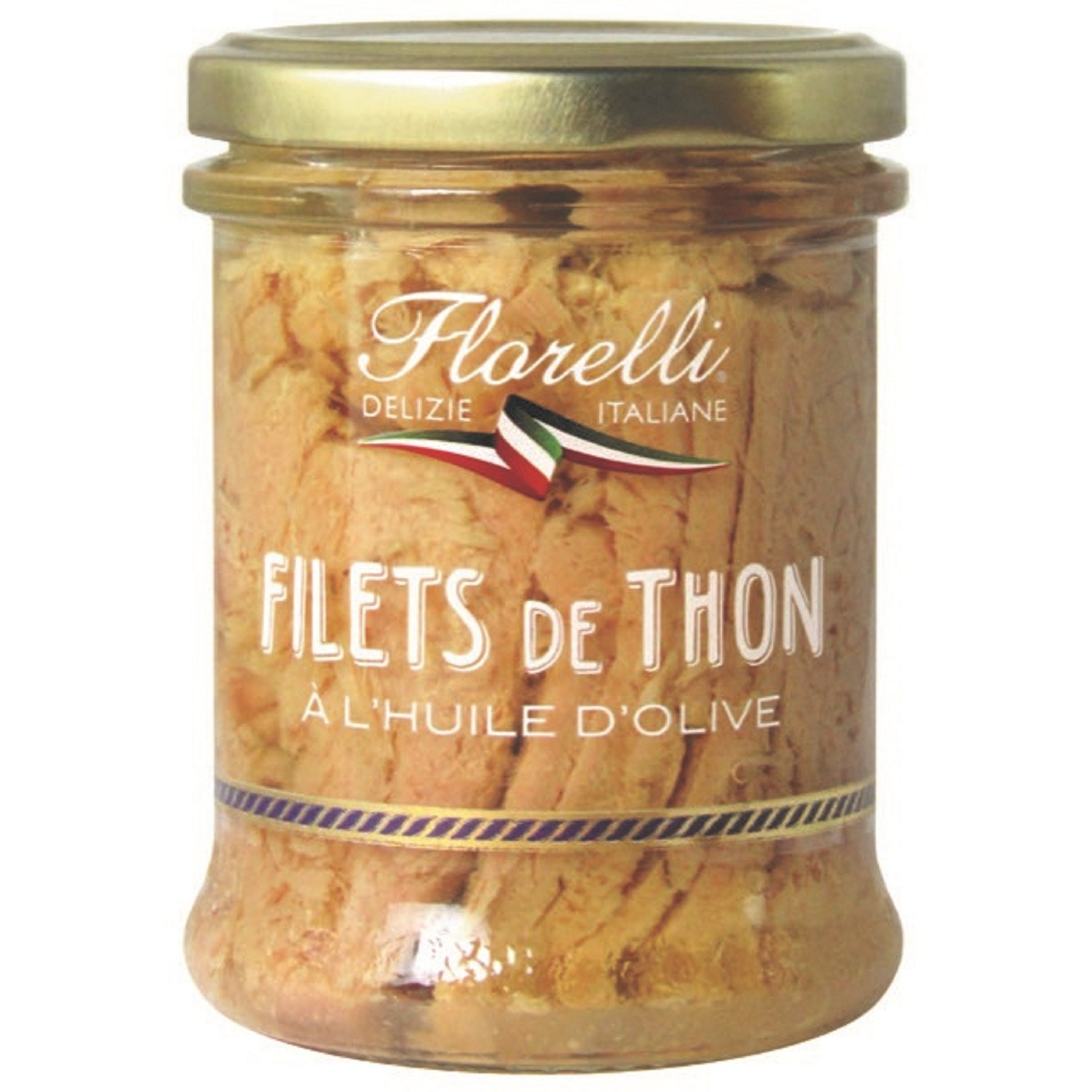 Filets de thon a l'huile d'olive.. Quantité : 200 g (poids net égoutté : 140 g) Marque : Florelli