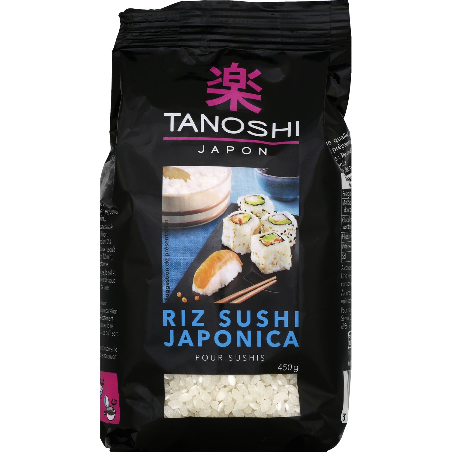 Riz sushi japonica pour sushi. Ingrédients : Riz rond Oryza sativa Japonica Quantité : 450 g Marque : Tanoshi