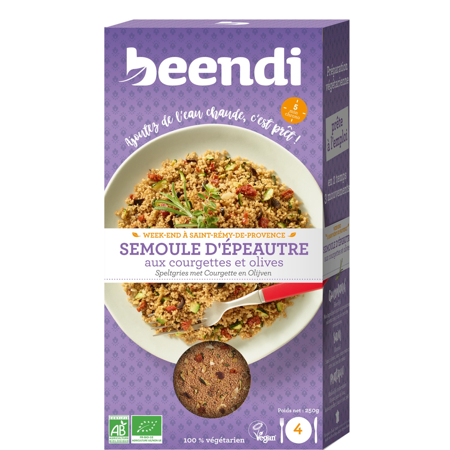Semoule epautre aux courgettes et olives. Ingrédients : 100% Végétarien : Semoule d'épeautre* (75%), Courgettes* (11,6%), Oignons* , Tomates*, Olives* (1,4%), Sel de Guérande non...