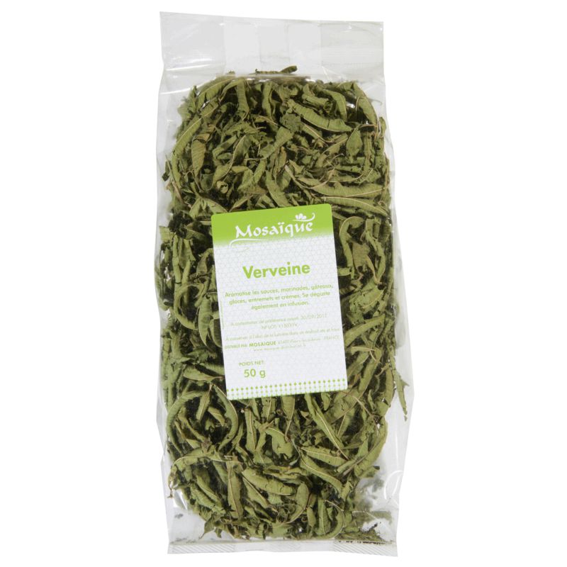 Verveine. Ingrédients : Mosaïque Aromatise les sauces, marinades, gâteaux, glaces, entremets et crèmes. Se déguste également en infusion. Quantité : 50g Marque : Mosaique