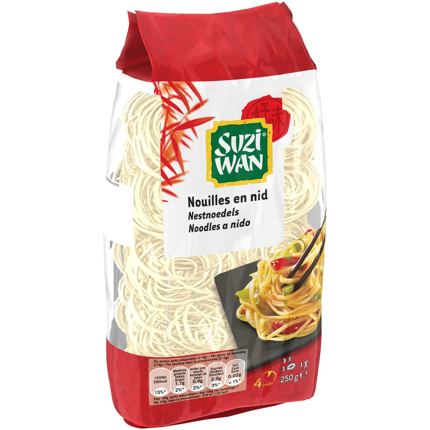 Nouilles en nid. Ingrédients : Semoule de _blé_ dur, _œuf_ Quantité : 250 g e Marque : Suzi Wan