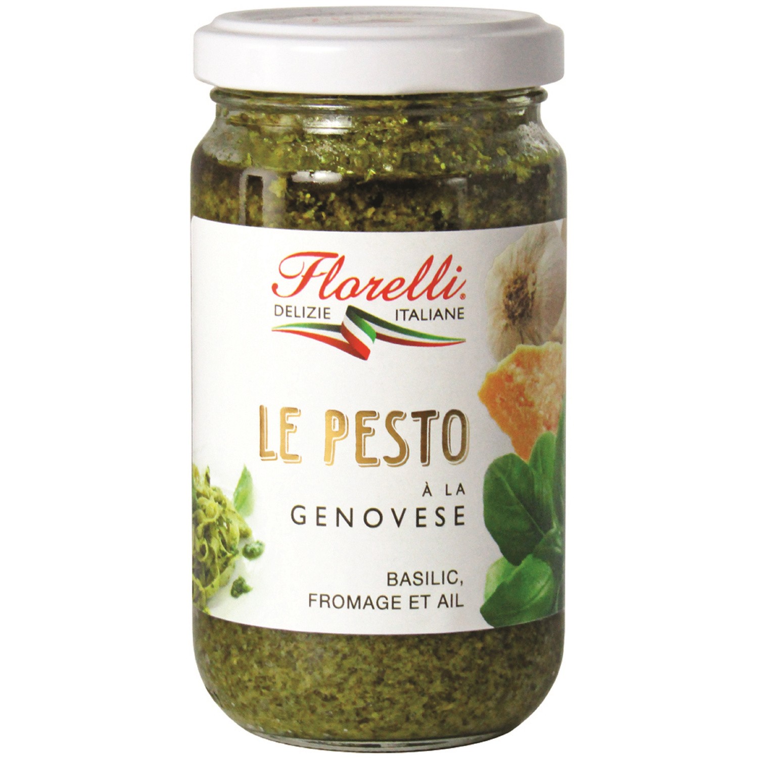 Pesto à la "Genovese" - Sauce à base de basilic, de fromages durs et d'ail. Ingrédients : Huile de tournesol, basilic (35%), flocons de pommes...