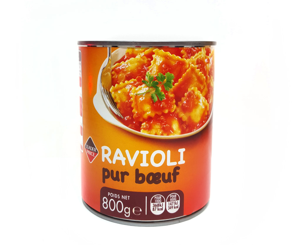 Ravioli à la viande pur boeuf. Ingrédients : Eau, pâte (semoule de _blé_ dur, _œufs_, eau), farce (viande de bœuf, chapelure, huile de colza, sel,...