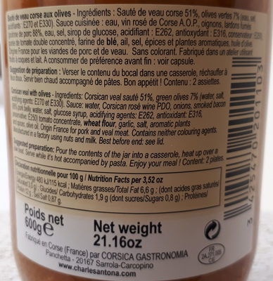 Veau Corse Aux Olives. Ingrédients : Sauté de veau corse 51 %, olives vertes 7 % (eau, sel, acidifiants : E270 et E330). Sauce cuisinée...