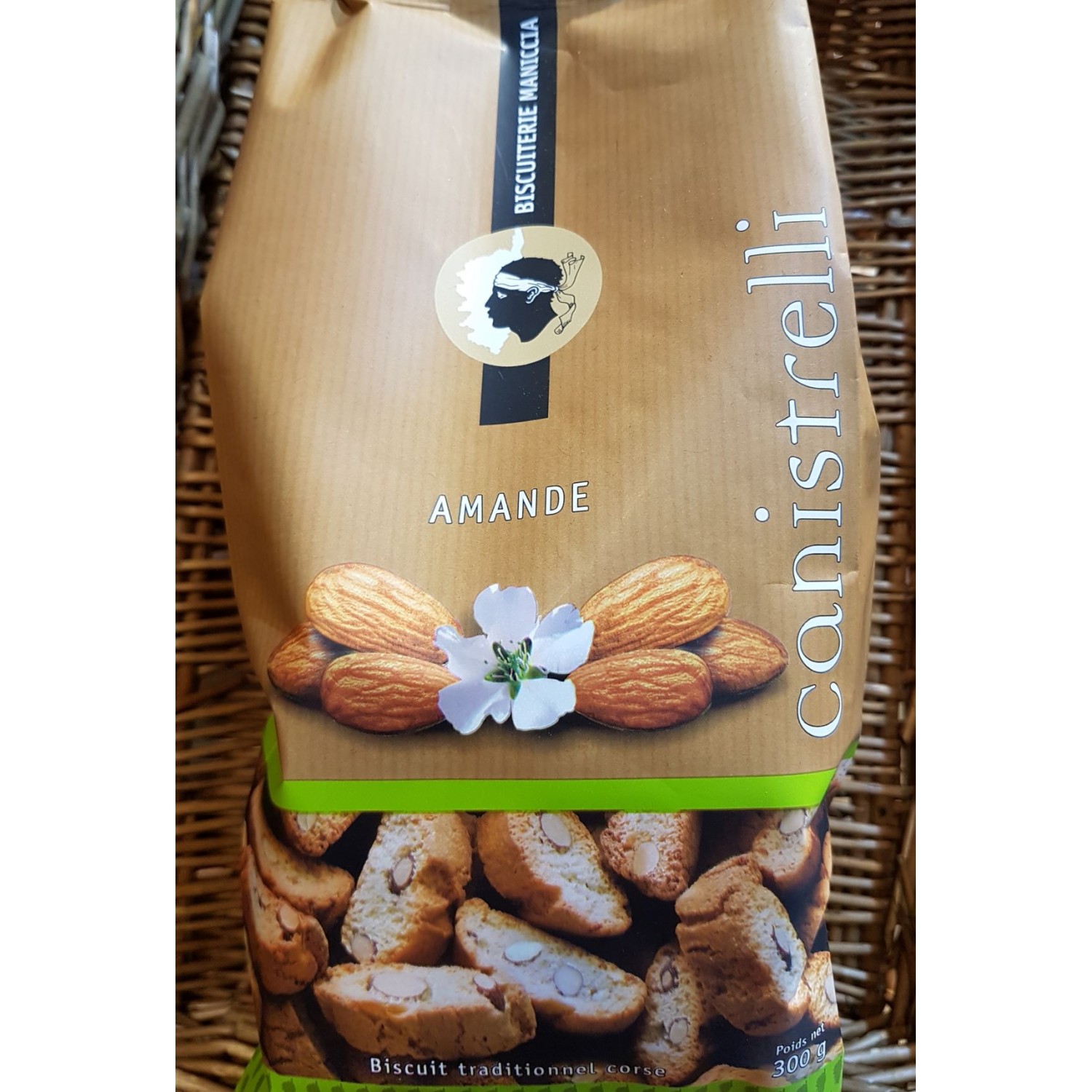 Canistrelli. Ingrédients : farine de blé, sucre, matières grasses végétales (graisses et huiles végétales raffinées, huile d'arachide, lécithine de soja E322), œufs, amandes 10%, lait,...
