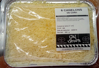 6 canelons de carn. Ingrédients : Farcit - 24% (carn (21%) (porc, pollastre i gallina), ceba, beixamel (_LLET_ en pols reconstituida, ceba, farina de _BLAT_,...