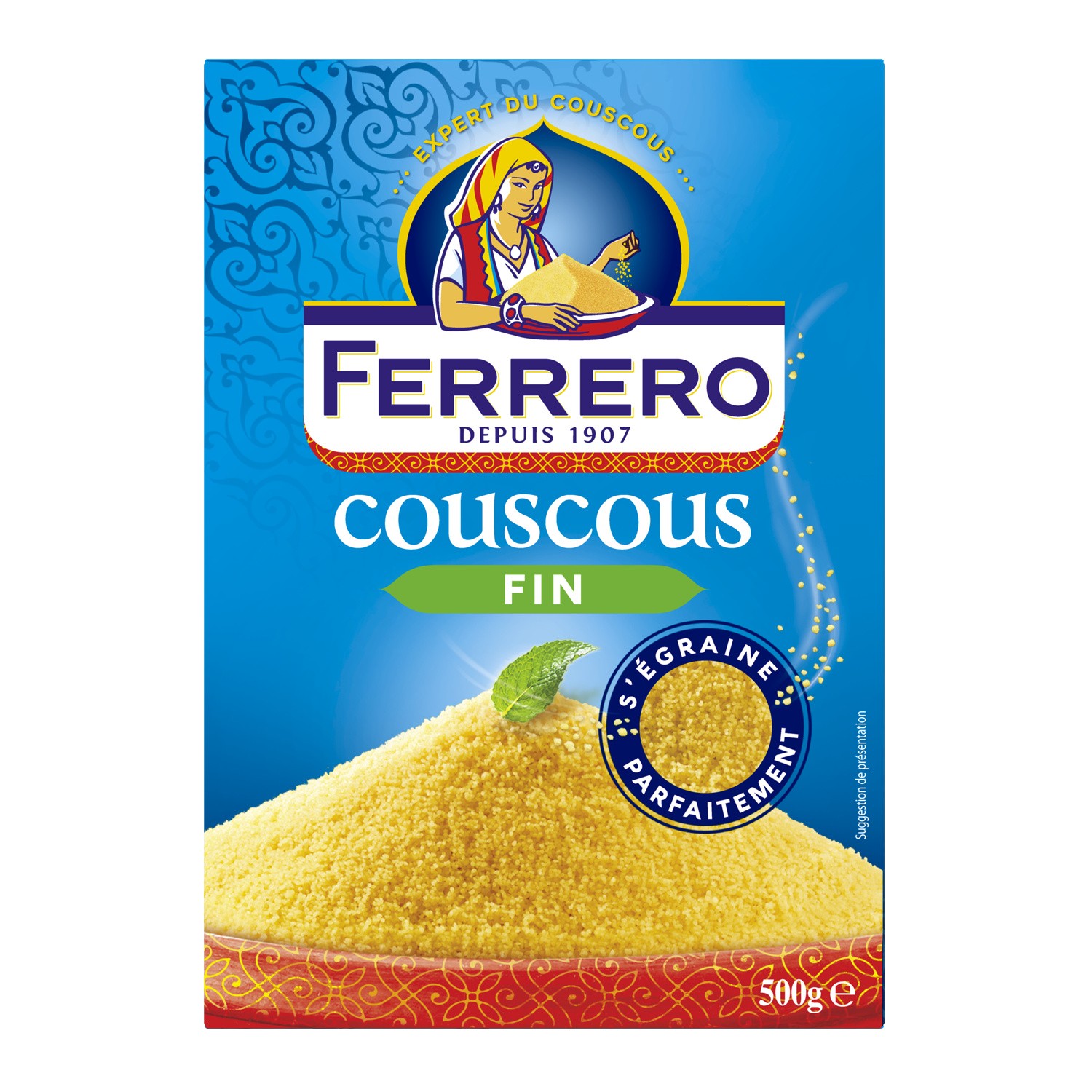 Graine de couscous fin. Ingrédients : Semoule de _blé_ dur de qualité supérieure. Quantité : 500 g Marque : Ferrero