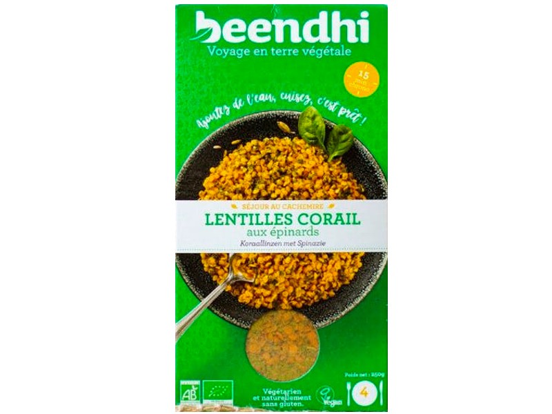 Curry de Lentilles aux épinards Façon Dal Cachemire. Ingrédients : Lentilles (89,2%), épinards (5%), feuilles de laurier, cannelle, cumin, graines de fenouil, curcuma, cardamome, poivre,...