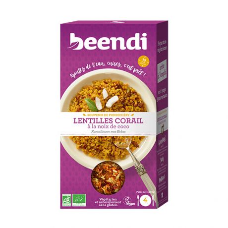 Préparation pour Curry de Lentilles à la Noix de Coco Façon Dal Pondichéry. Ingrédients : Lentilles corail* (65,2 %), Oignons*, Tomates* (12,1 %), Noix coco*...