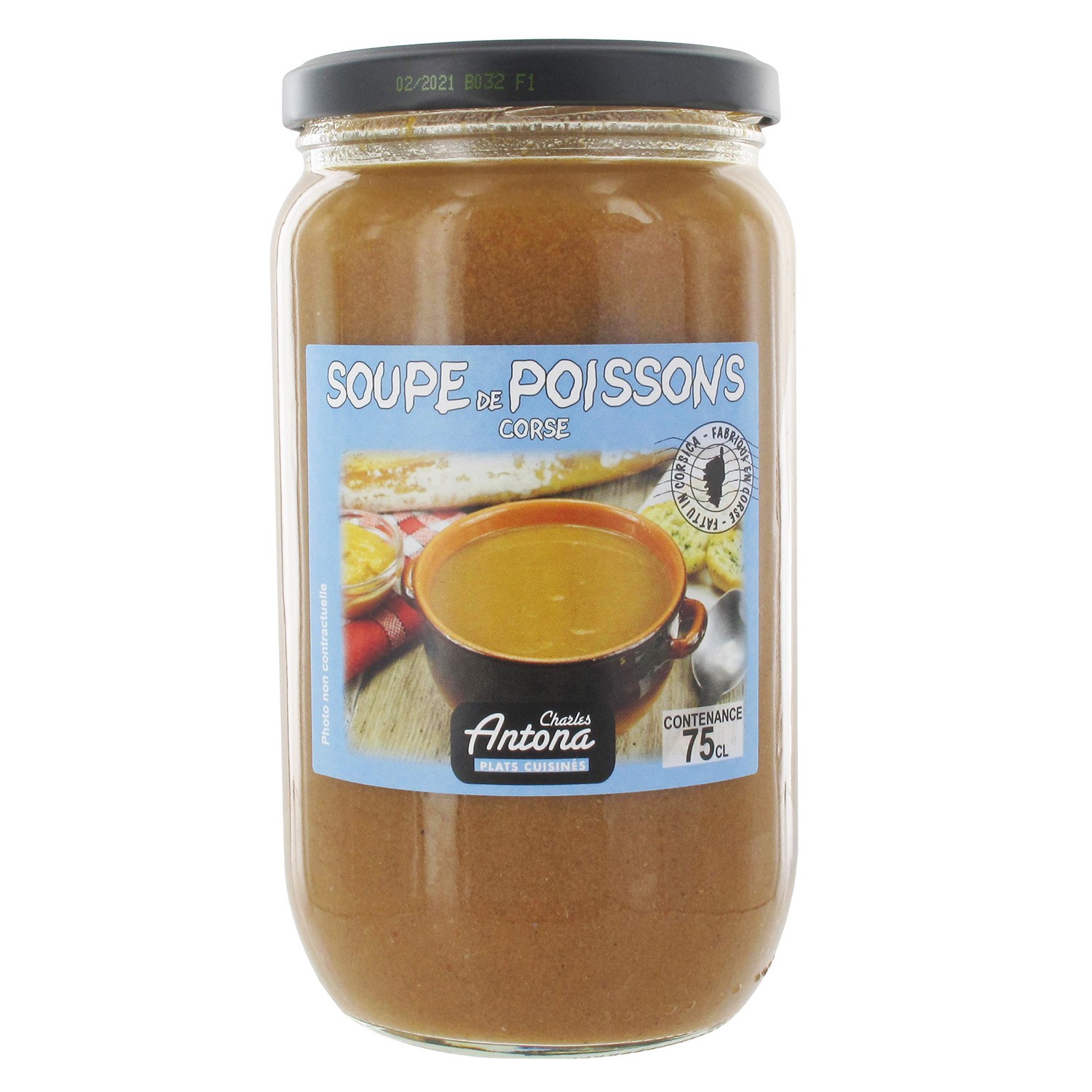 Soupe de poissons. Ingrédients : Eau, _poisson_ 28%, oignon, concentré de tomate, farine de _blé_, ail, sel, huile d'olive, plantes aromatiques et épices Quantité :...