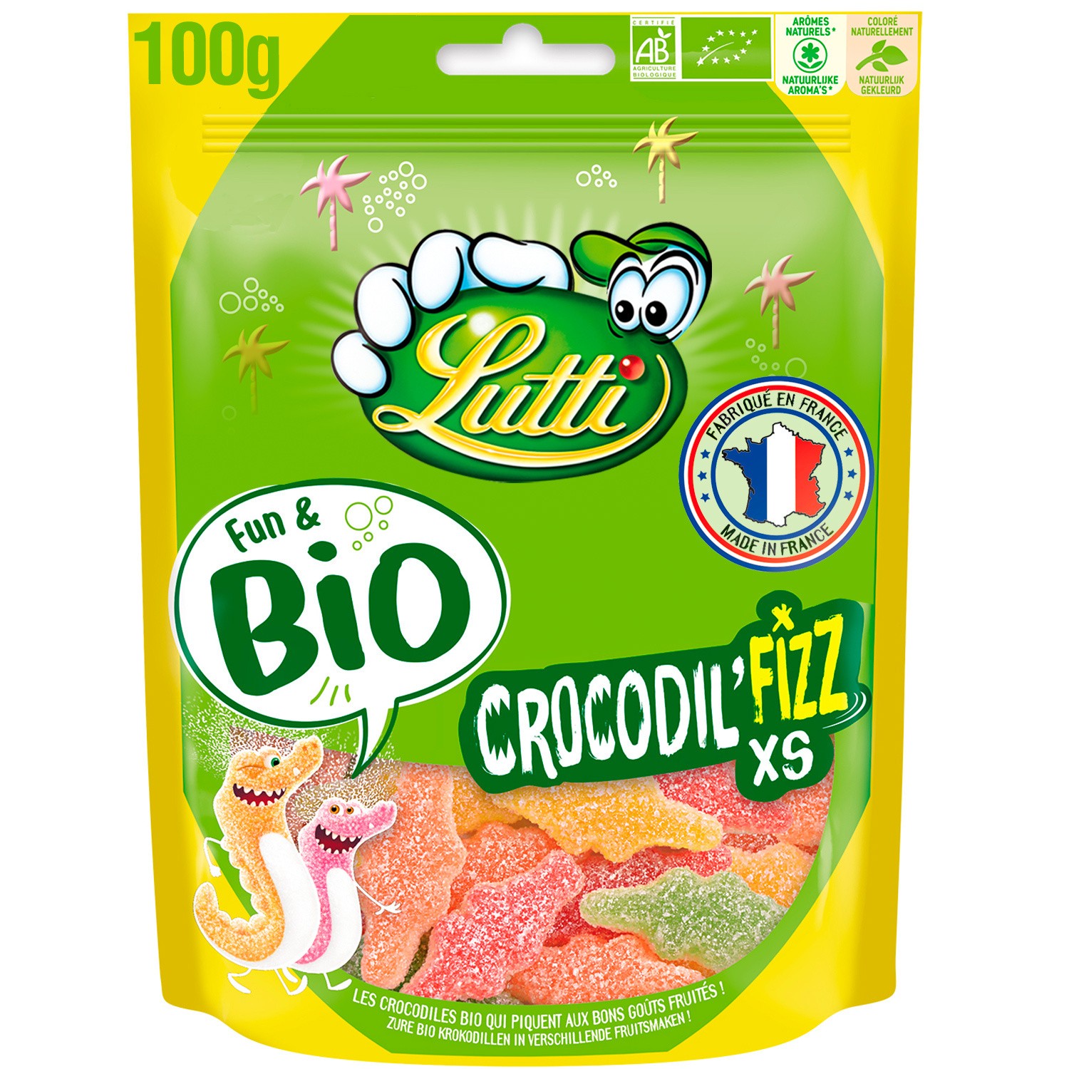 Crocodil'FIZZ. Ingrédients : Sucre de canne Gélatine Acidlifjants (Acide lactioue Acide citrique), Artiden Arômes naturels de fruits (Orange, Citron) et autres arômes naturels ce danas...