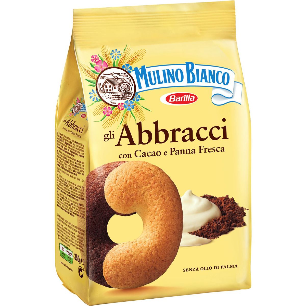 Abbracci. Ingrédients : farine de blé, sucre, beurre (lait)) huile de tournesol, œufs, cacao 2,4%, crème pasteurisée (lait) 2,1%i lait écrémé en Poudre, miel, self...