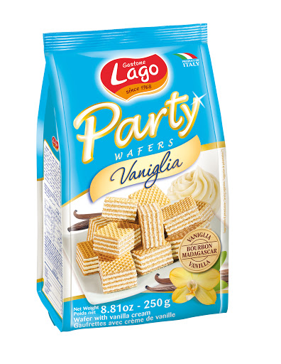 Gastone lago elledi, party wafer with vanilla cream, vaniglia. Ingrédients : Wheat flour, sugar, vegetable oils (palm, coconut), whey powder, soy lecithin, salt, sodium hydrogen...