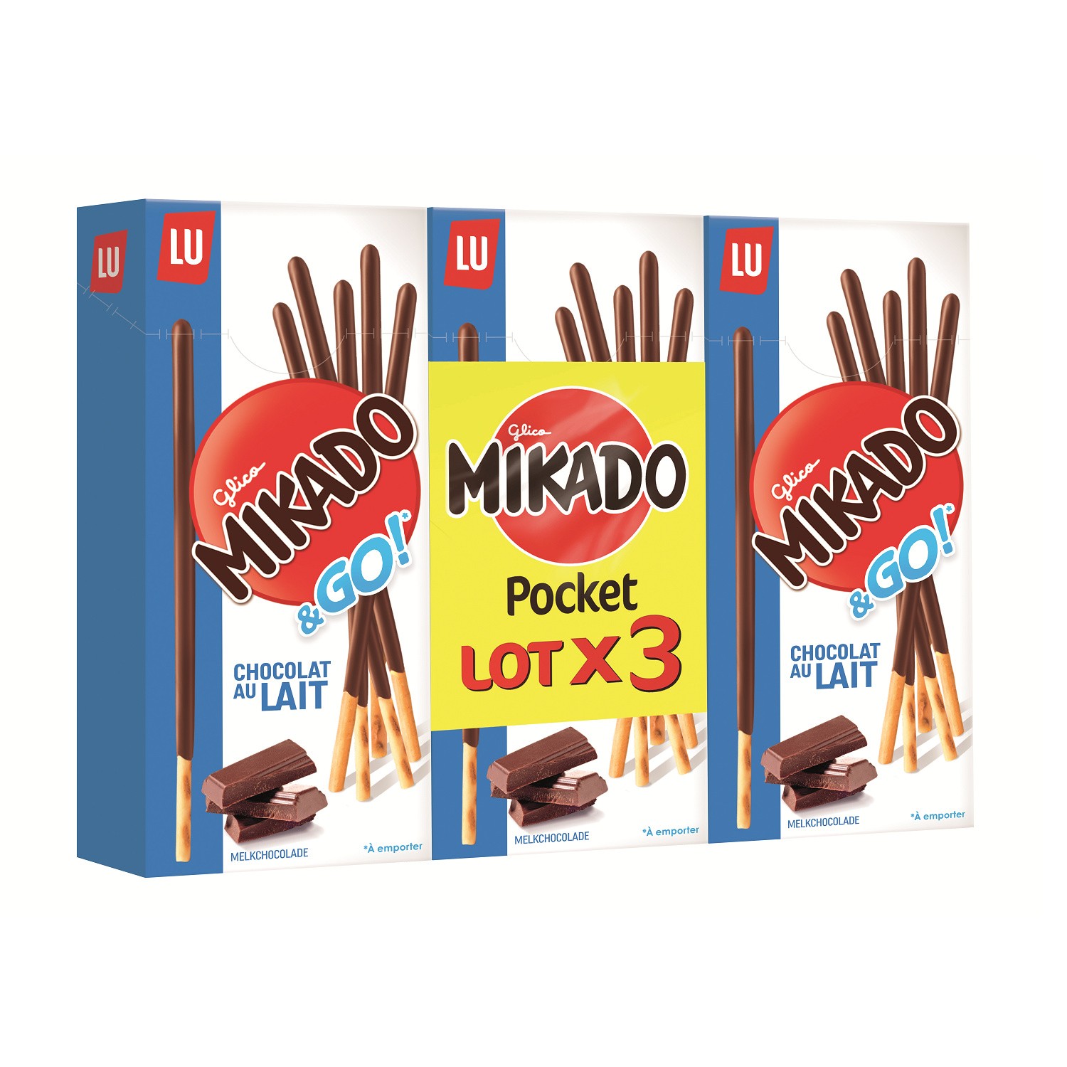Mikado Chocolat au Lait. Ingrédients : Farine de blé, sucre, beurre de cacao, pâte de cacao, lait écrémé en poudre, graisses végétales (palme, noix de...