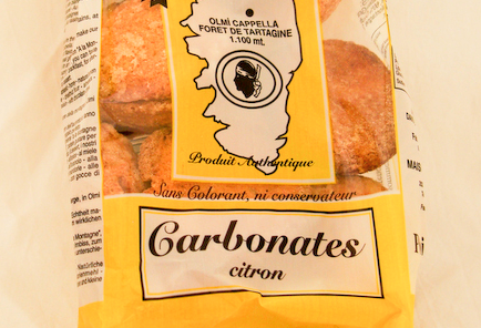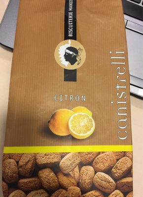 Canistrelli citron. Ingrédients : farine de blé, sucre, matières grasses végétales (graisses et huiles végétales raffinées, huile d'arachide, lécithine de soja E322), œufs, tait, poudre...