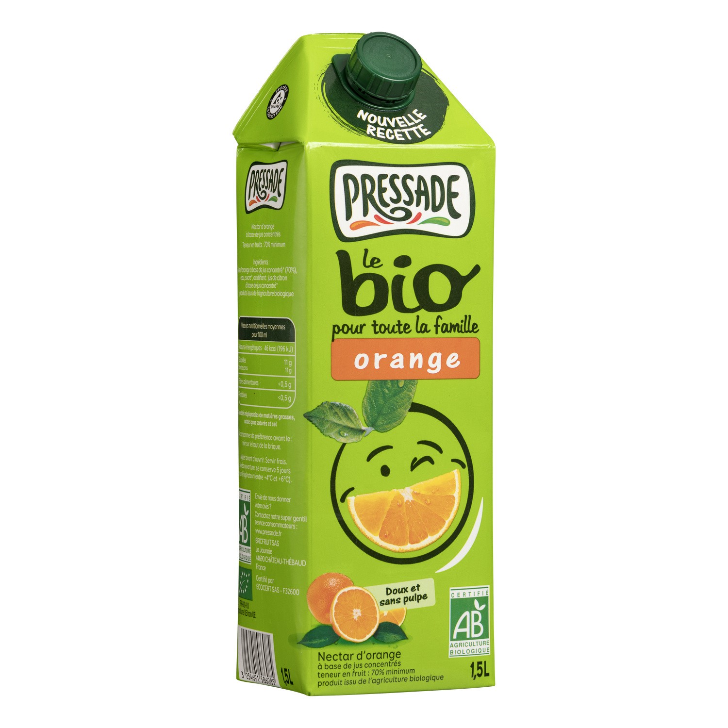 Nectar d'orange. Ingrédients : Jus d'orange à base de jus concentré* (70%), eau, sucre*. * produits issus de l'agriculture biologique Quantité : 1.5 L Marque...
