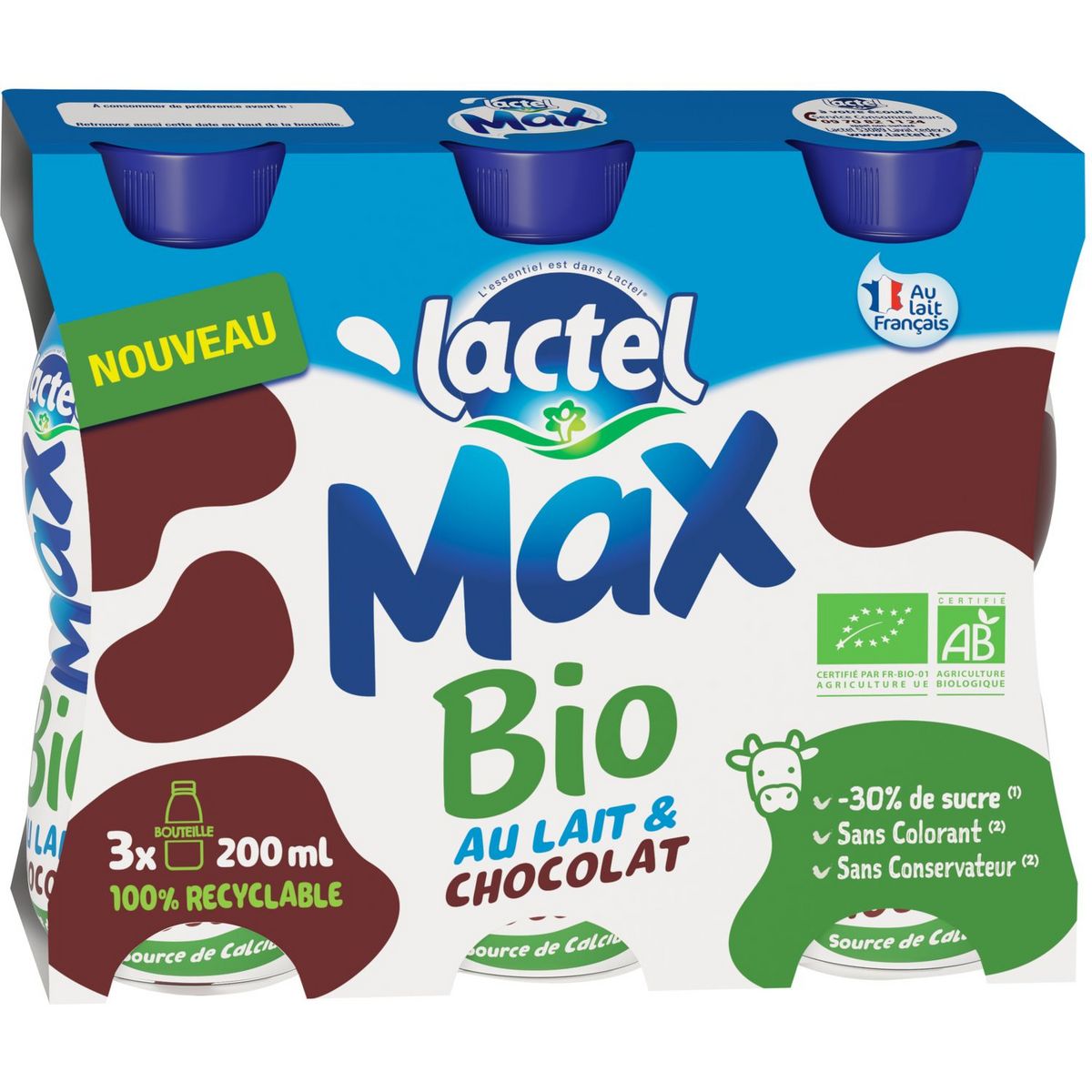 Lactel Max Bio au lait et chocolat. Ingrédients : lait demi écrémé origine France (94%), chocolat en poudre (4,3%) (sucre, cacao), amidon de riz, arômes...