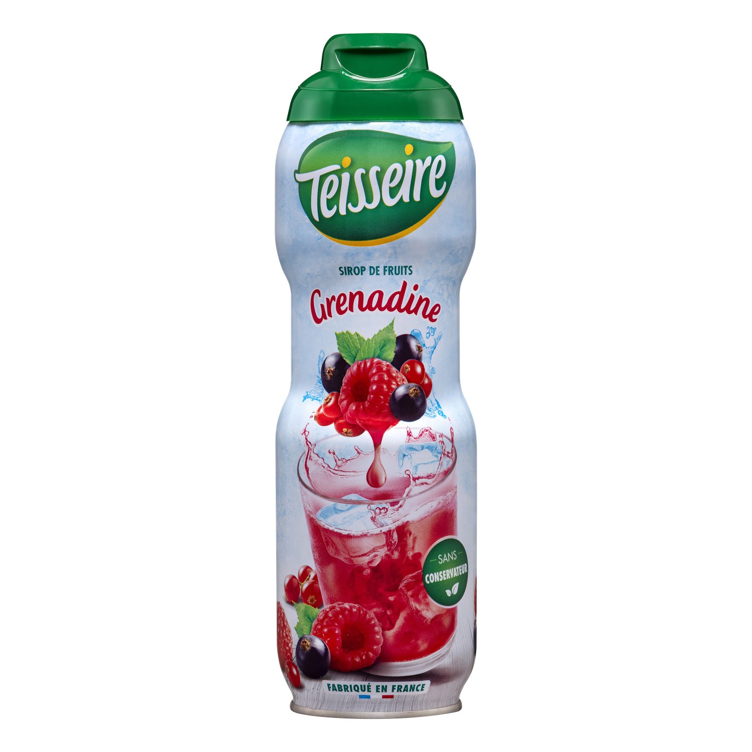 Sirop de Grenadine. Ingrédients : Sucre, sirop de glucose-fructose, eau, jus de fruits à base de concentrés: 11% (fruits rouges 8% : framboise 3%, sureau...