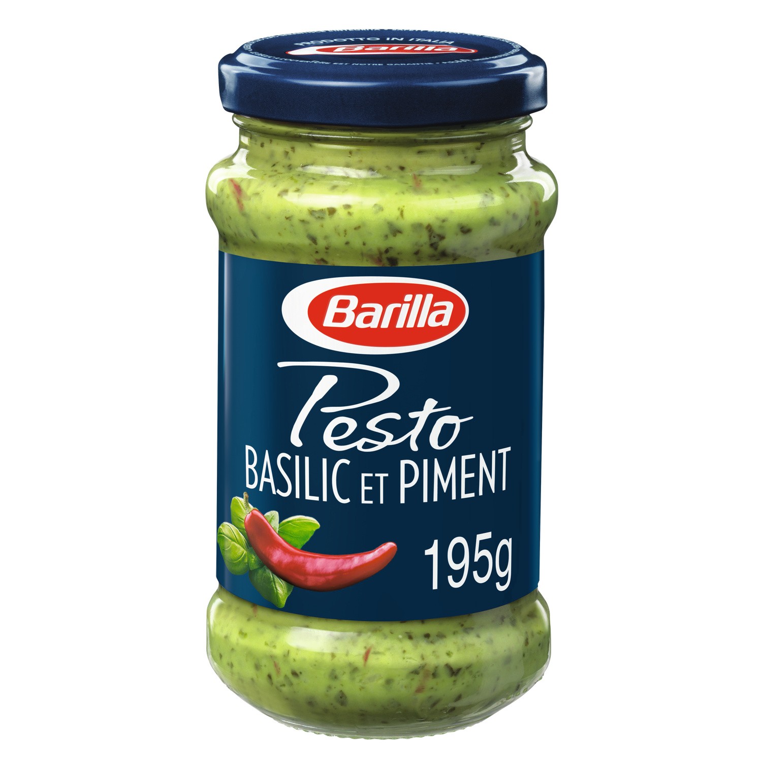 Sauce Pesto basilic et piment. Ingrédients : Huile de tournesol, basilic (32%), fibre de maïs, NOIX DE CAJOU, piment (4%), lactosérum en poudre (LAIT), poivron...