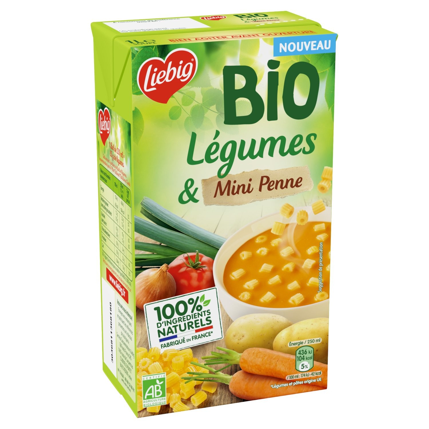 Liebig soupe BIO Légumes et Mini Penne. Marque : Liebig 1LIngrédientsIngrédients: eau,carotte³,jus de tomates³ à base de concentré,pomme de terre³,PÂTES³ cuites 4,4% (semoule de BLɳ...