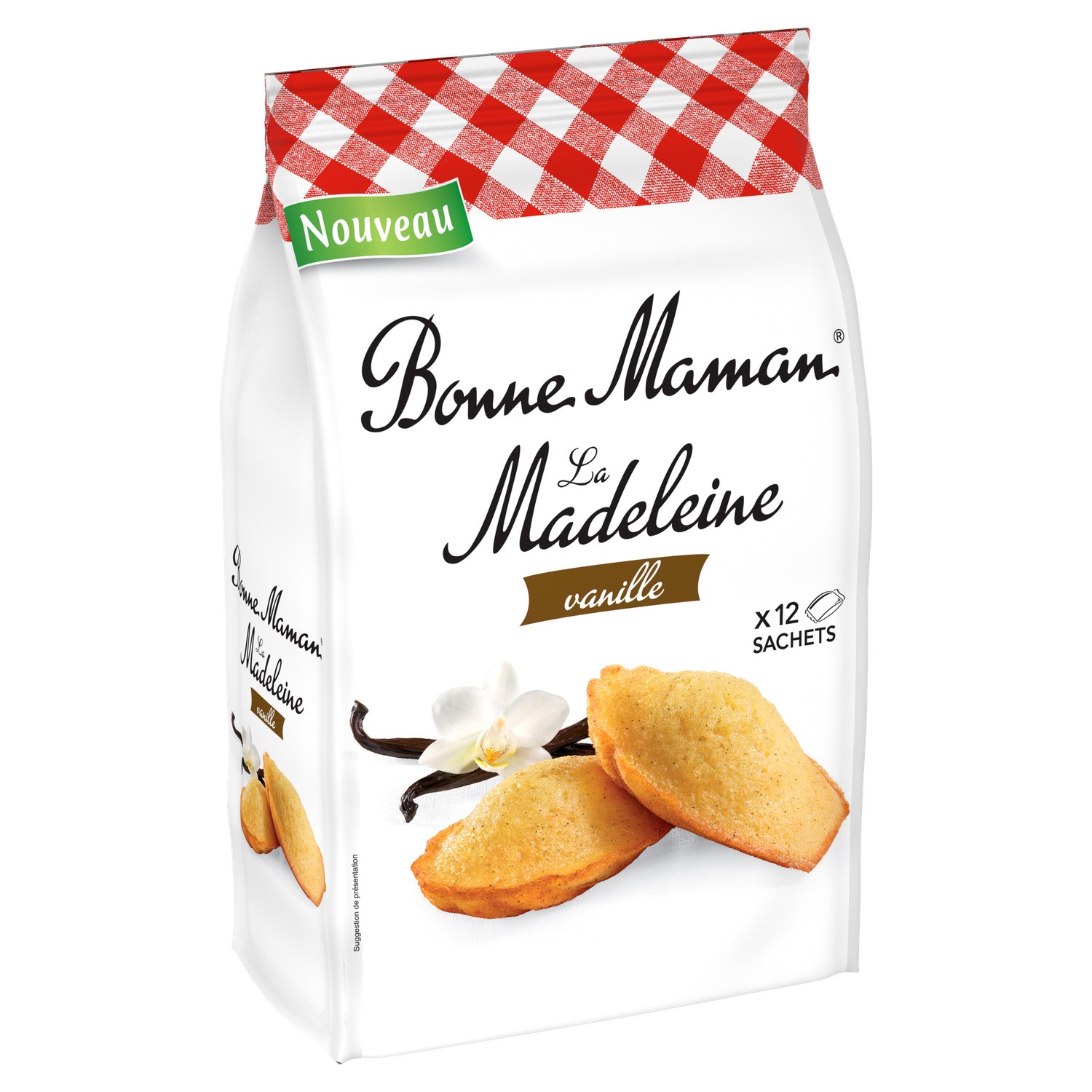 Madeleines vanille. Ingrédients : beurre (26%), farine de blé, oeufs frais (24%), sucre, sirop de sucre inverti, amande en poudre, arômes naturels de vanille (contient...