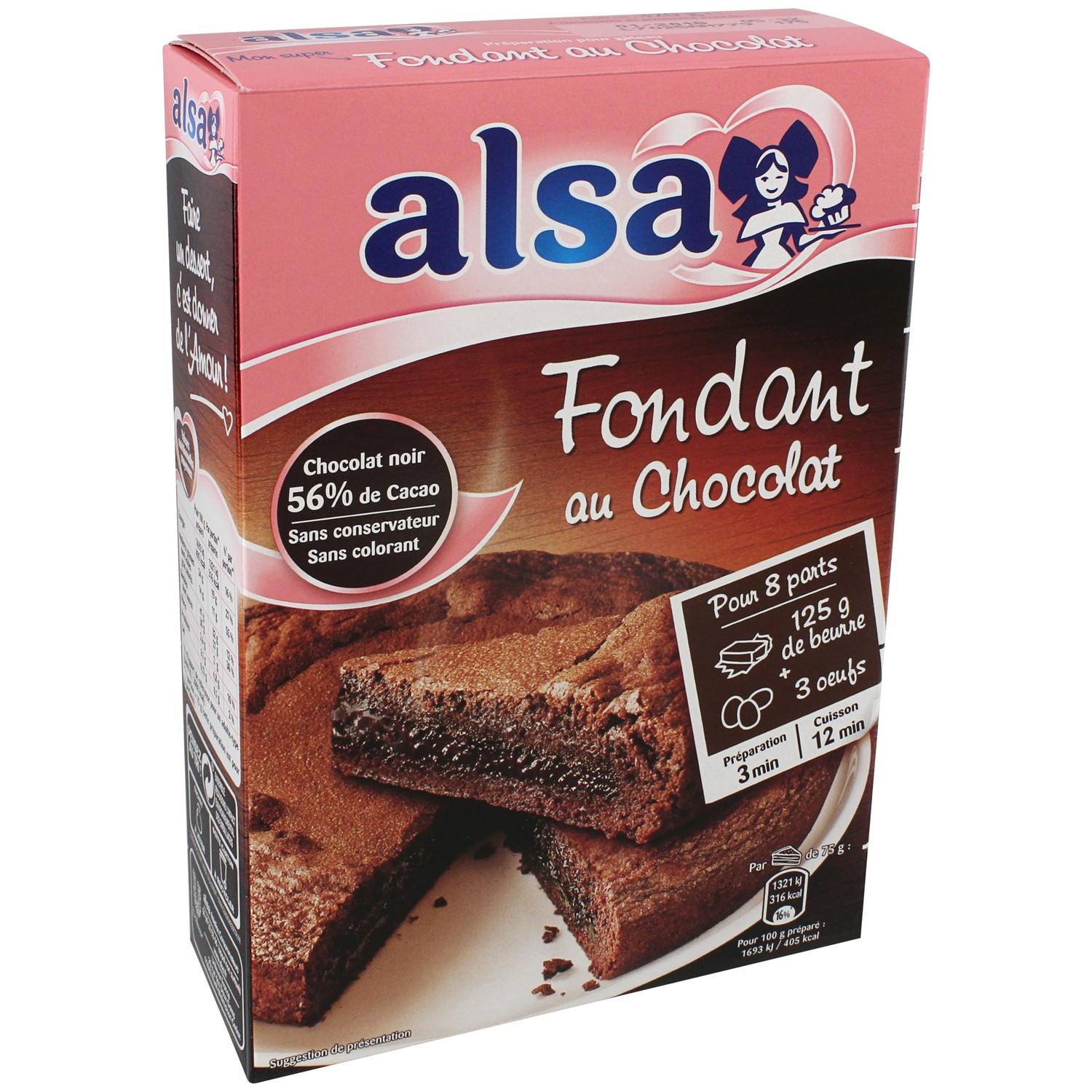 Fondant au chocolat. Ingrédients : Sucre, chocolat en poudre : 34% (sucre, cacao), chocolat noir extra-fin à 56% de cacao : 14% (pâte de cacao,...