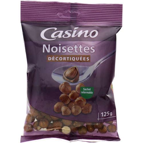 noisettes entières décortiquées. Ingrédients : _Noisettes_ 100%. Traces d'autres _fruits à coque_, d'_arachides_, de _lait_ et d'_œufs_. Quantité : 125 g Marque : Casino
