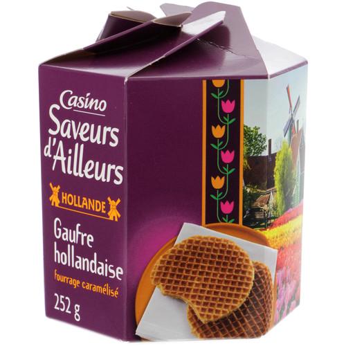 8 Gaufres avec 50% de fourrage caramélisé. Ingrédients : Sirop de glucose-fructose - farine de _blé_ - graisse et huile végétales (palme, colza) - sucre...
