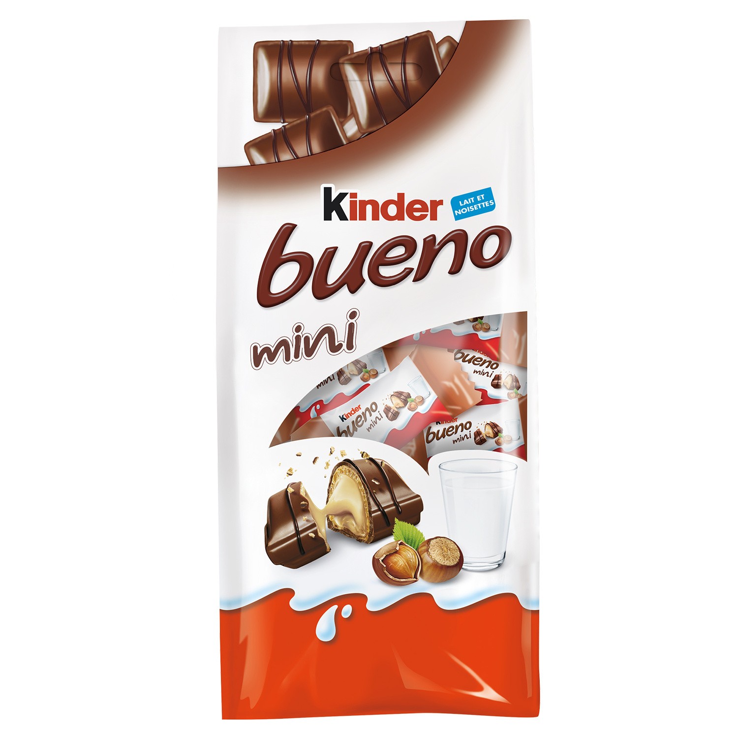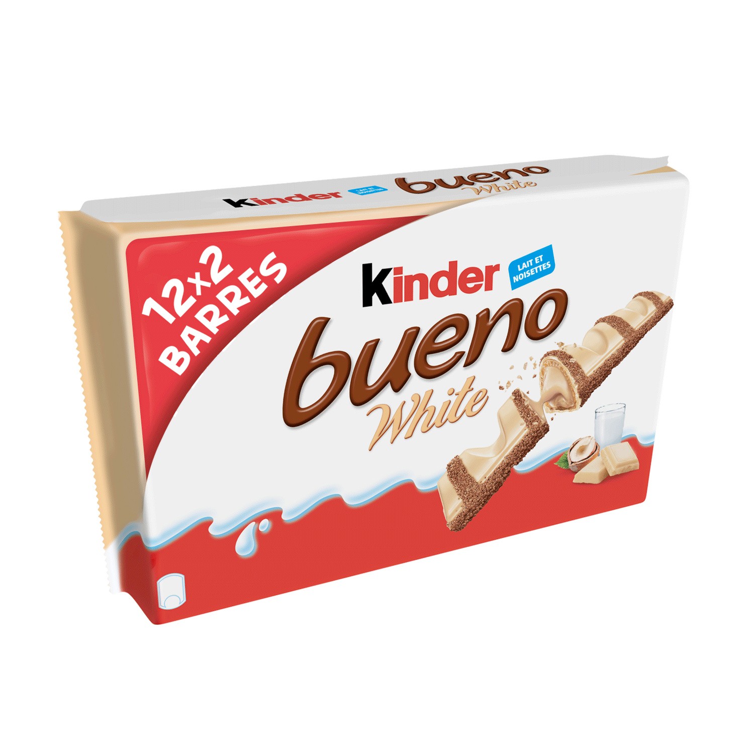 KINDER BUENO WHITE : Fines gaufrettes enrobées de chocolat blanc et de pépites au cacao (6,5%), fourrées lait et noisettes broyées. Ingrédients : Chocolat blanc...