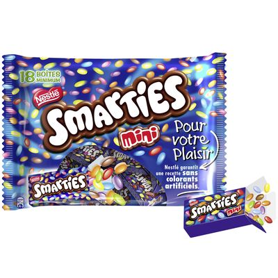 bonbons de chocolat au lait (65%) dragéifiés. Ingrédients : Sucre, beurre de cacao (14%), LAIT écrémé en poudre, pâte de cacao, matière grasse de LAIT...