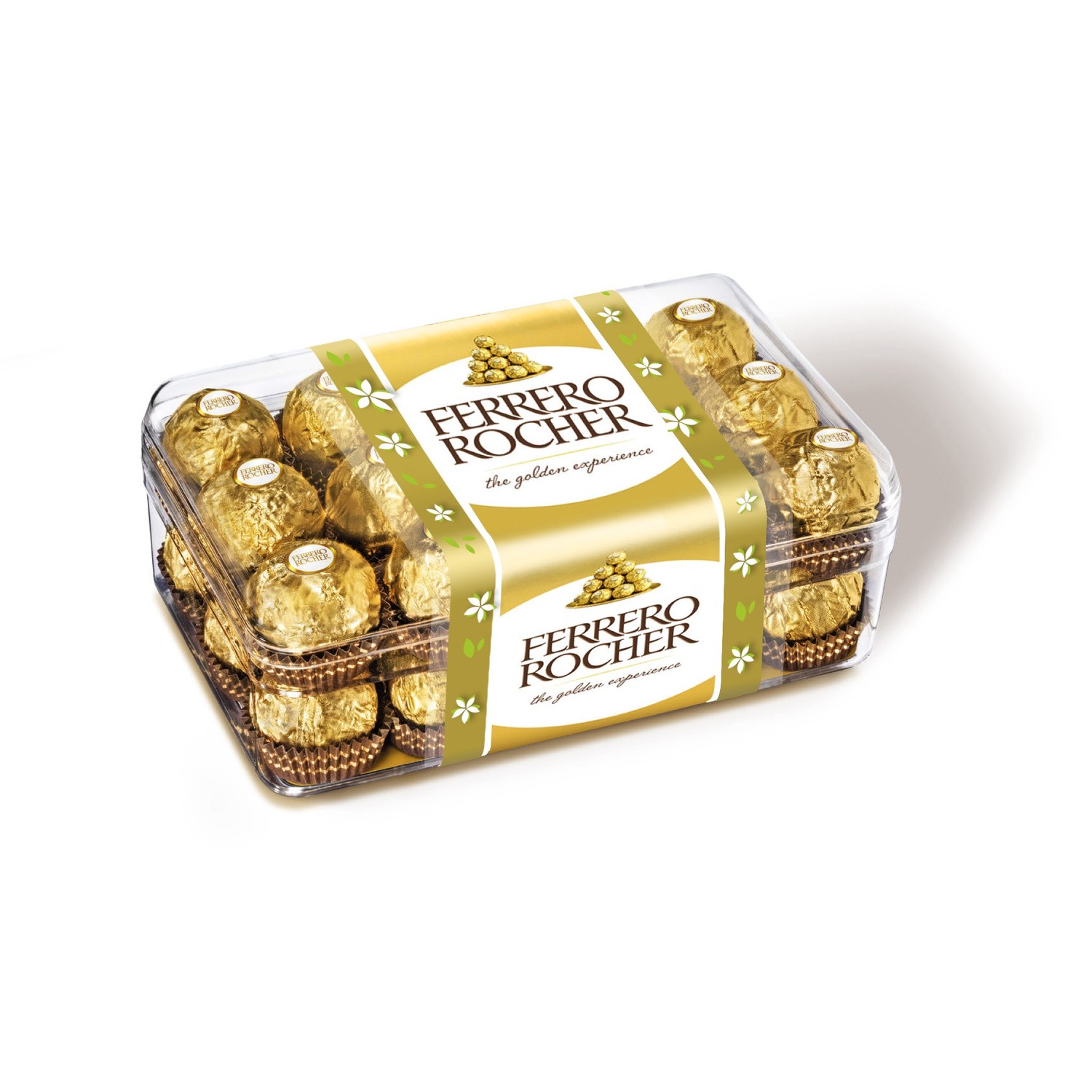 FERRERO ROCHER : Fines gaufrettes enrobées de chocolat au lait et noisettes broyées et fourrées noisette. Ingrédients : Chocolat au LAIT 30% (sucre, beurre de...