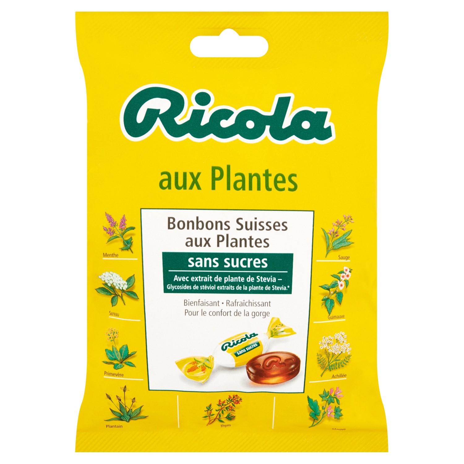 Bonbons sans sucres avec extrait de plante des Stévia. Ingrédients : Isomalt, extrait (1%) du mélange de 13 plantes Ricola, colorant (caramel ordinaire), sorbitol, édulcorant...