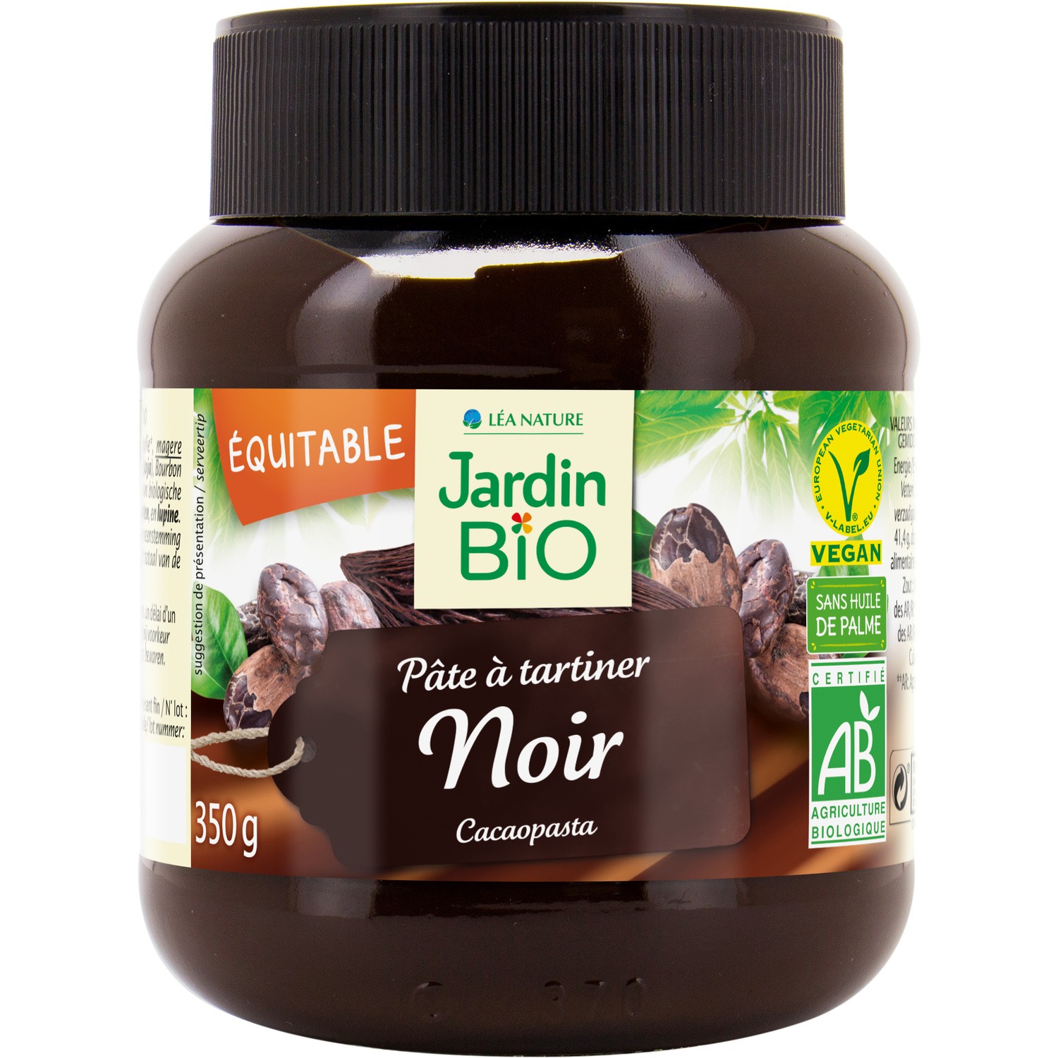 Pâte a tartiner. Ingrédients : Sucre de canne brut, huile de tournesol, poudre de cacao maigre 30 %, émulsifiant : lécithines (_soja_), extrait de vanille...