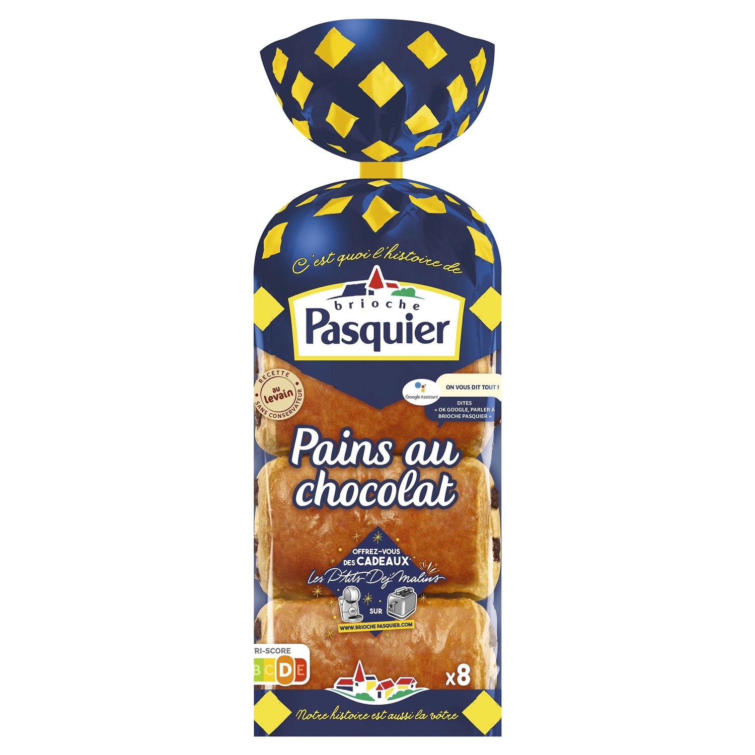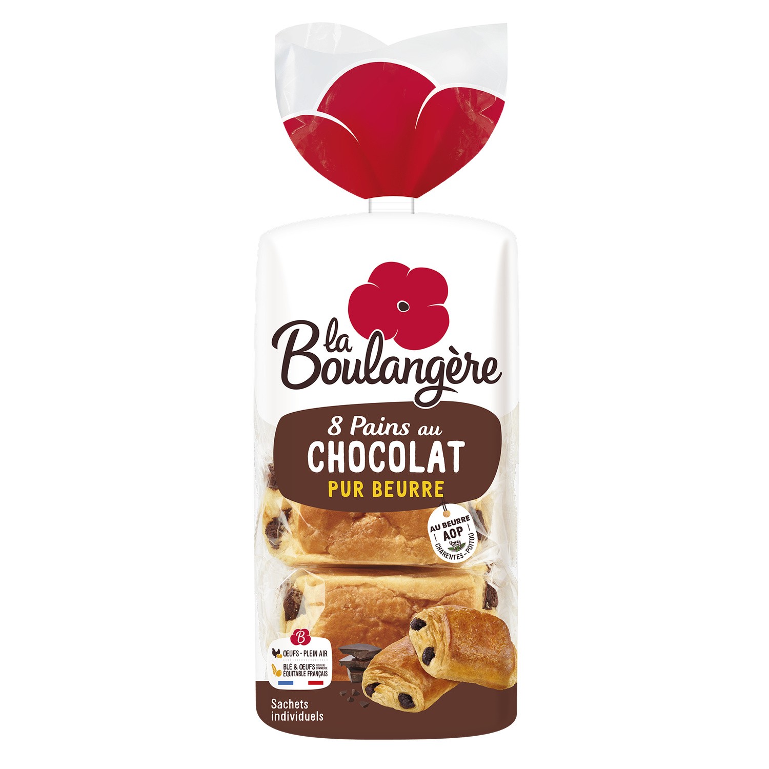 8 Pains au Chocolat pur beurre. Ingrédients : Farine de _blé_* 37%, _beurre_ AOP Charentes-Poitou 19 %, chocolat 17 % (sucre, pâte de cacao, beurre...