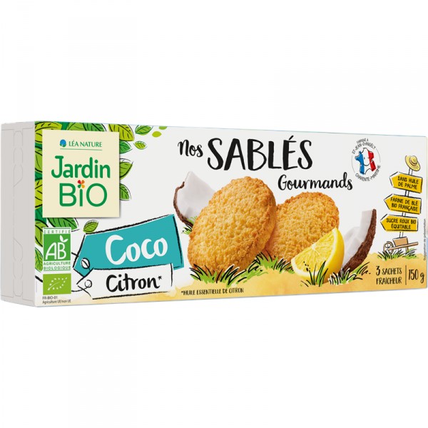 Sablés coco citron. Ingrédients : farine de blé, sucre de canne brut, noix de coco râpée 24%, huile de colza, beurre (lait), œufs entiers en...
