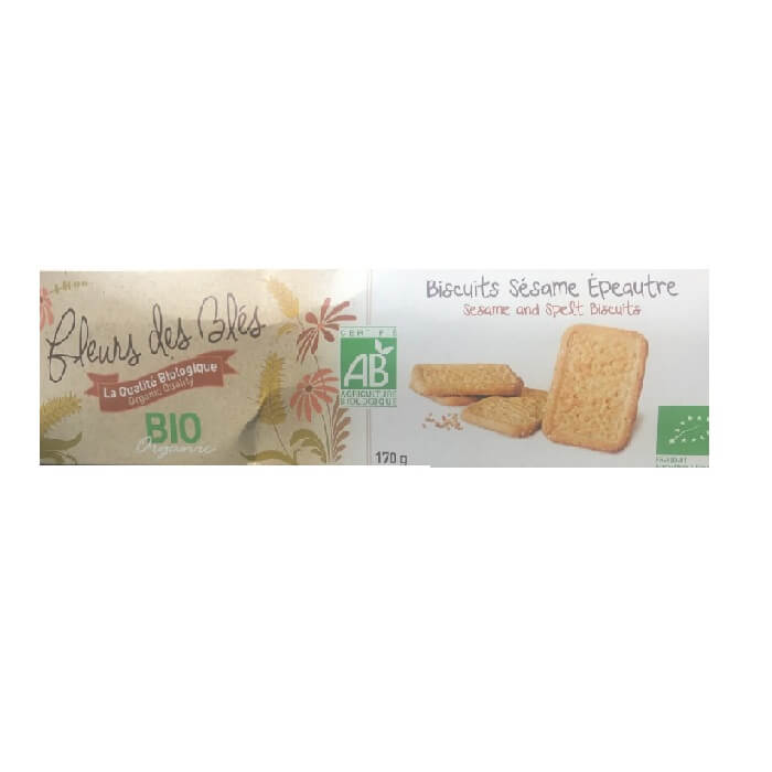 BISCUITS SESAME EPEAUTRE. Ingrédients : Farine de blé*, sucre*, huile de palme*, farine d'épeautre* 17%, graines de sésame* 11%, amidon de blé*, poudre de lait...