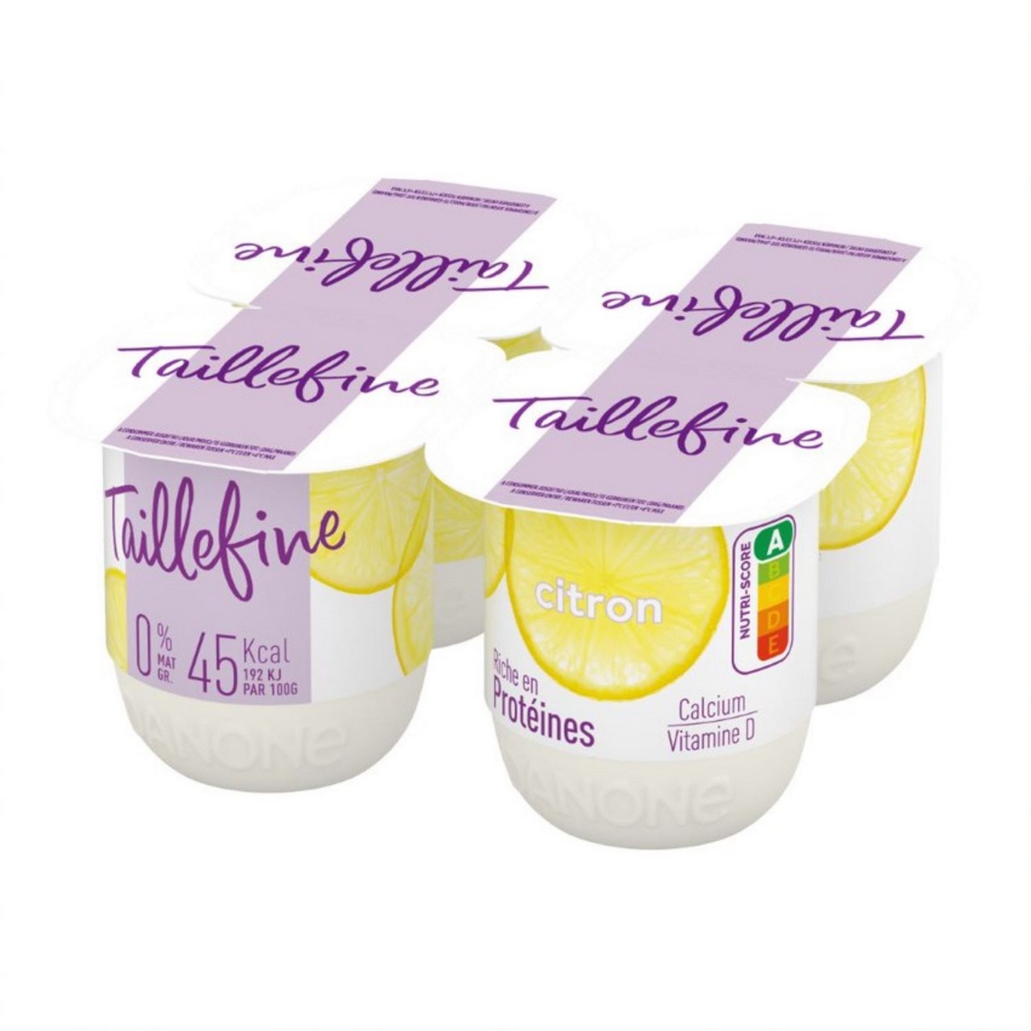 Taillefine citron 0%. Ingrédients : lait écrémé (Origine: France) ait écrémé concentré ou en poudre (Origine: UB) citron (2%), jus de citrona , base de...
