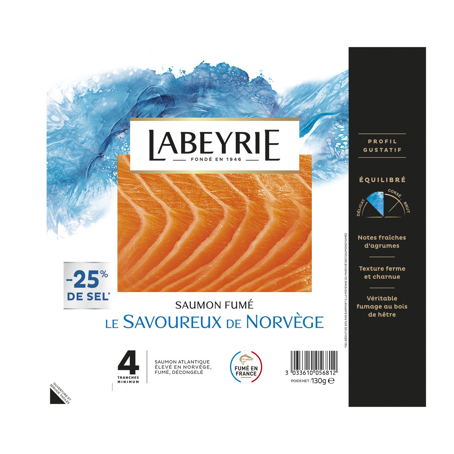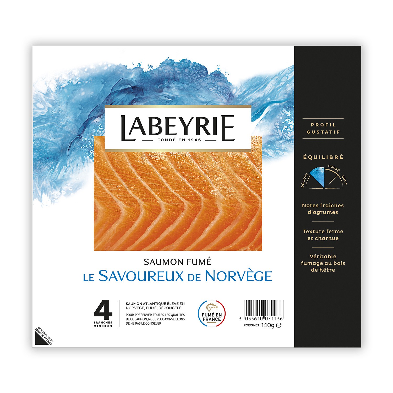 Saumon fumé Le Norvège. Ingrédients : Saumon atlantique (Salmo salar), sel. Quantité : 140 g Marque : Labeyrie Origine : Norvège